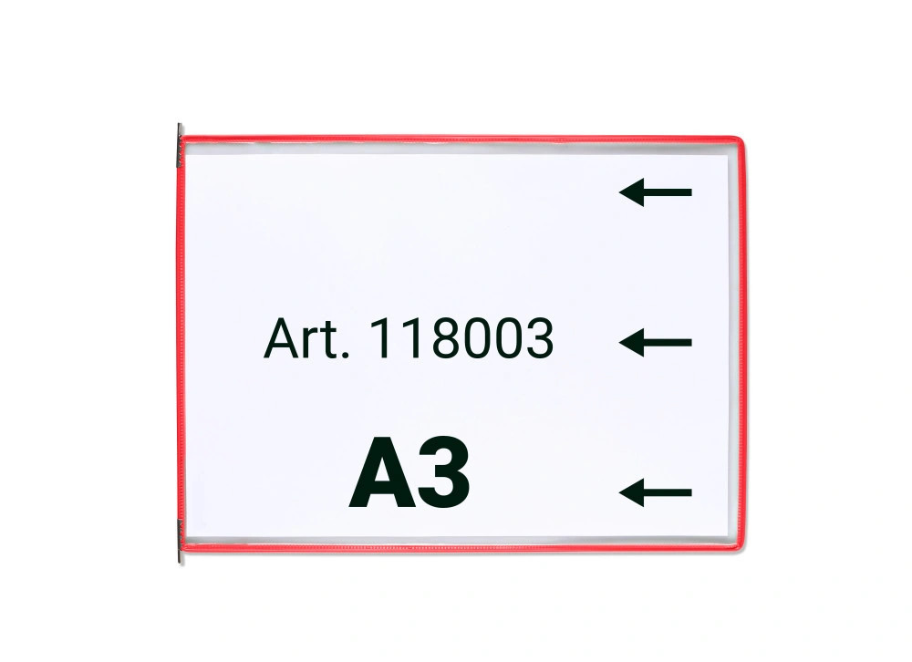 Bemutatótábla A3, piros, fekvő, külső oldalán nyitott, 10 db - 10 db A bemutatótábla kiemelkedő minőségének köszönhetően flexibilis, strapabíró és rendkívül hatékony. A kétoldalú bemutatótábla a Tarifold tartókba tervezett prezentációs rendszerek részét képezi. A táblák műanyaggal bevont, acélhuzal kerete tartós és egyben rugalmas tartást eredményez. A tábla a fém forgócsapoknak köszönhetően a tartókba könnyen behelyezhető és eltávolítható. Alkalmas ipari üzemekben való használatra. A bemutatótábla védi a dokumentumokat a szennyeződésektől és a nedvességtől, ugyanakkor a dokumentumok könnyen cserélhetők.