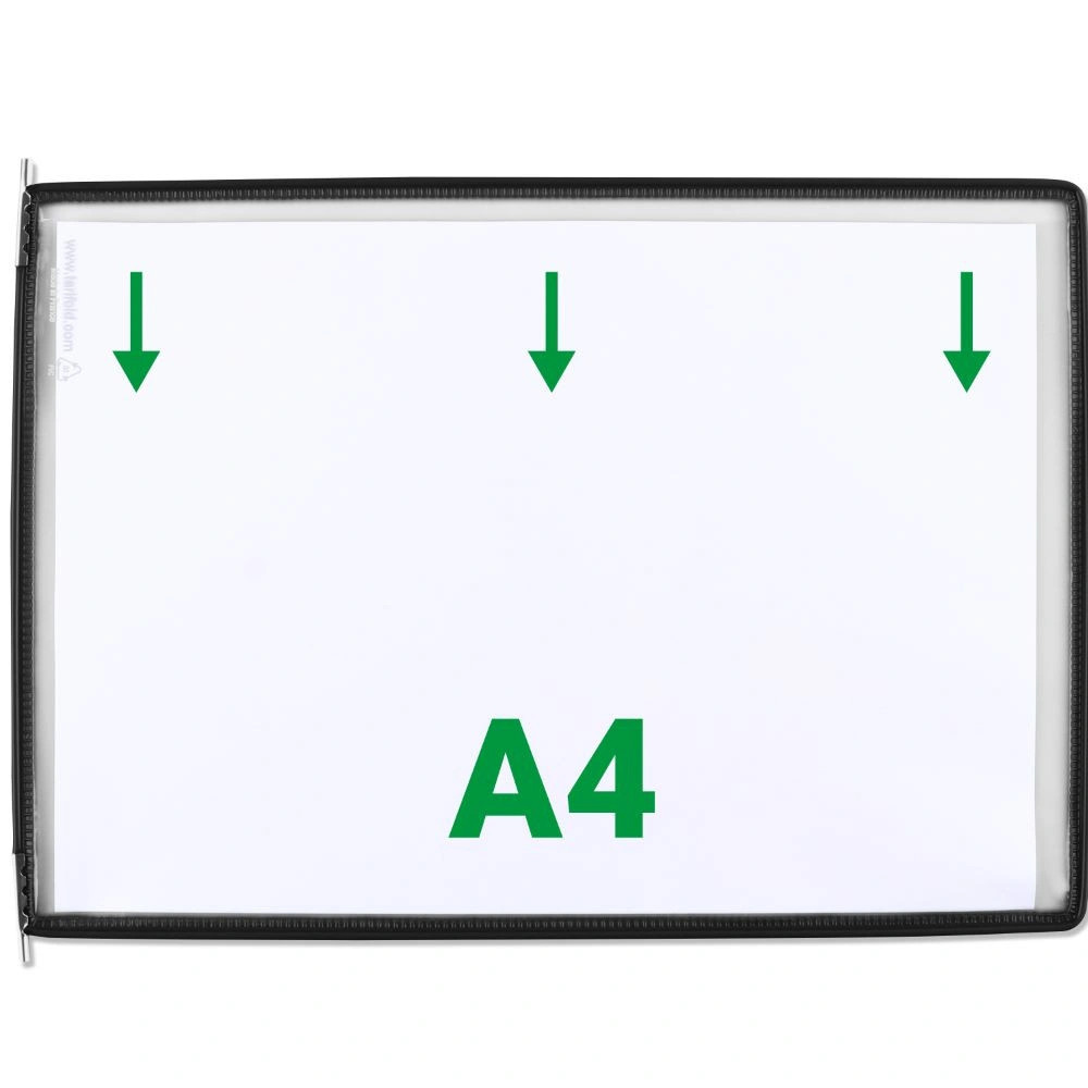 Bemutatótábla A4, fekete, fekvő, felül nyitott, 10 db - 10 db A bemutatótábla kiemelkedő minőségének köszönhetően flexibilis, strapabíró és rendkívül hatékony. A kétoldalú bemutatótábla a Tarifold tartókba tervezett prezentációs rendszerek részét képezi. A táblák műanyaggal bevont, acélhuzal kerete tartós és egyben rugalmas tartást eredményez. A tábla a fém forgócsapoknak köszönhetően a tartókba könnyen behelyezhető és eltávolítható. Alkalmas ipari üzemekben való használatra. A bemutatótábla védi a dokumentumokat a szennyeződésektől és a nedvességtől, ugyanakkor a dokumentumok könnyen cserélhetők.
