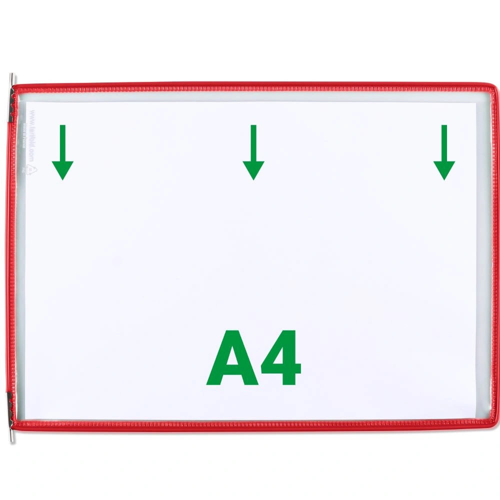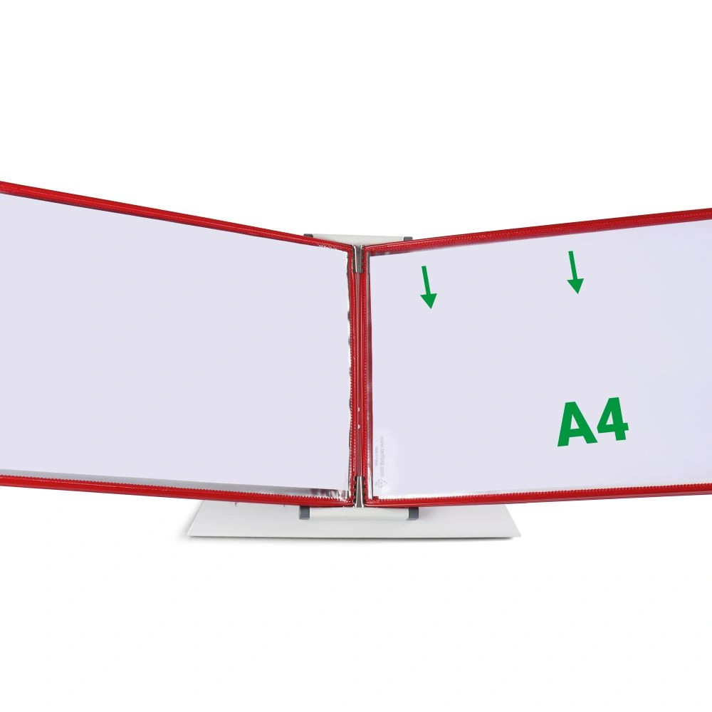Bemutatótábla A4, piros, fekvő, felül nyitott, 10 db - 10 db A bemutatótábla kiemelkedő minőségének köszönhetően flexibilis, strapabíró és rendkívül hatékony. A kétoldalú bemutatótábla a Tarifold tartókba tervezett prezentációs rendszerek részét képezi. A táblák műanyaggal bevont, acélhuzal kerete tartós és egyben rugalmas tartást eredményez. A tábla a fém forgócsapoknak köszönhetően a tartókba könnyen behelyezhető és eltávolítható. Alkalmas ipari üzemekben való használatra. A bemutatótábla védi a dokumentumokat a szennyeződésektől és a nedvességtől, ugyanakkor a dokumentumok könnyen cserélhetők.