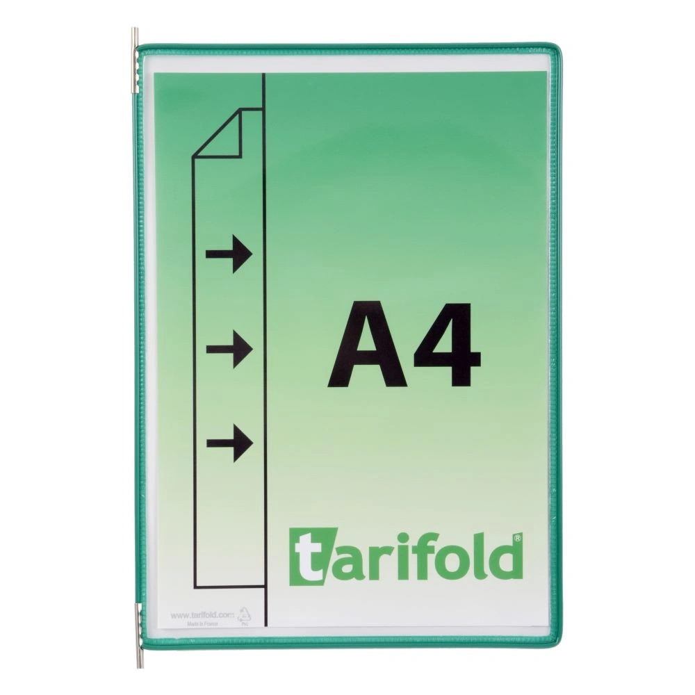 Bemutatótábla A4, vegyes, álló, belső oldalán nyitott, 10 db - 10 db A bemutatótábla kiemelkedő minőségének köszönhetően flexibilis, strapabíró és rendkívül hatékony. A kétoldalú bemutatótábla a Tarifold tartókba tervezett prezentációs rendszerek részét képezi. A táblák műanyaggal bevont, acélhuzal kerete tartós és egyben rugalmas tartást eredményez. A tábla a fém forgócsapoknak köszönhetően a tartókba könnyen behelyezhető és eltávolítható. Alkalmas ipari üzemekben való használatra. A bemutatótábla védi a dokumentumokat a szennyeződésektől és a nedvességtől, ugyanakkor a dokumentumok könnyen cserélhetők.