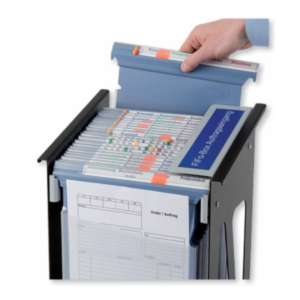 A vezetősínek ferde helyzetének köszönhetően a hátul behelyezett tasakok automatikusan előre csúsznak. Ez azt jelenti, hogy az éppen feldolgozás alatt álló folyamat mindig elöl van. Az oldalsó fedél megakadályozza a dokumentumok eltávolítását. A FiFo Box alkalmas A4-es álló formátumú (tartalom nélküli) Datoclip+ tartók tárolására.