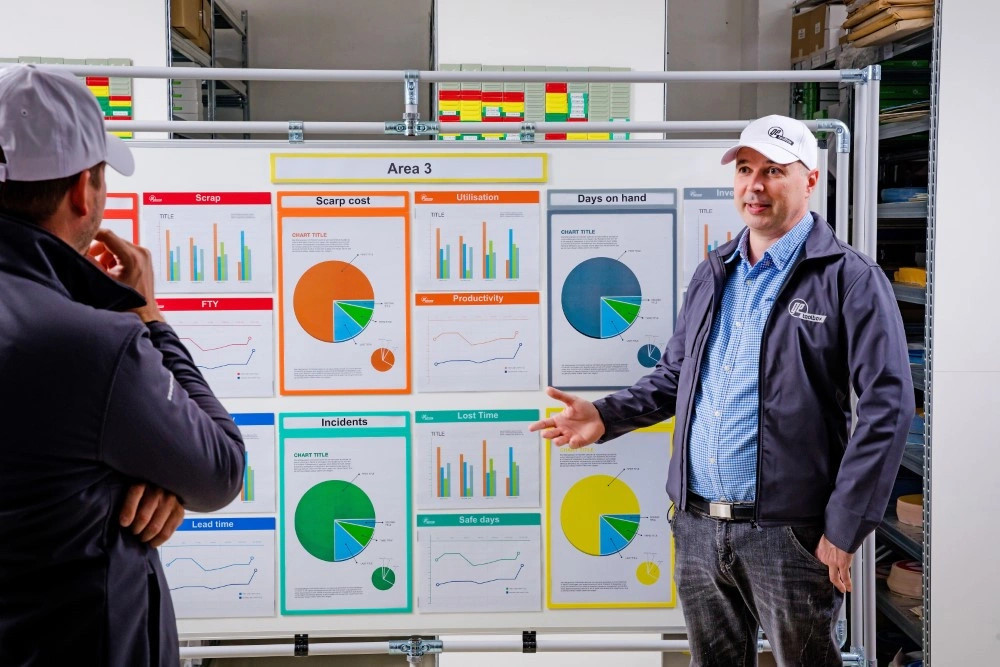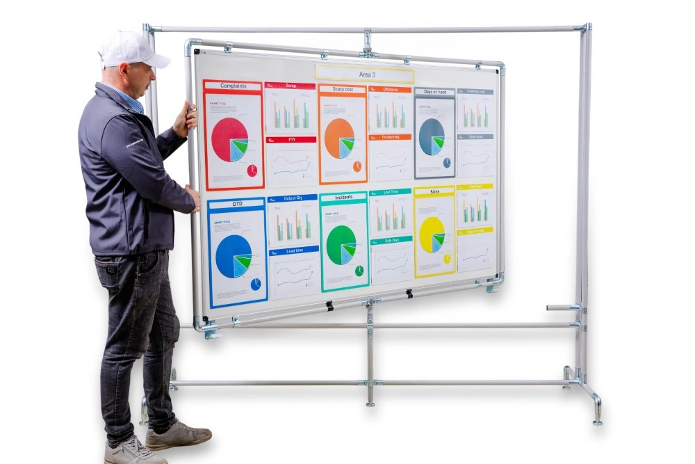 Bármilyen helyre könnyen telepíthető, és jelentős mérete miatt bőven van hely minden termelésre vonatkozó információnak és KPI-nek, amire napi rendszereséggel szüksége van. És ami még jobb, ha az egyik oldalon elfogy a hely, könnyen megfordíthatod egy mozdulattal és a másik oldala is használha, hogy a szintén tágas hátoldal is kihasználhassa a további információk és a KPI-k megjelenítésére.