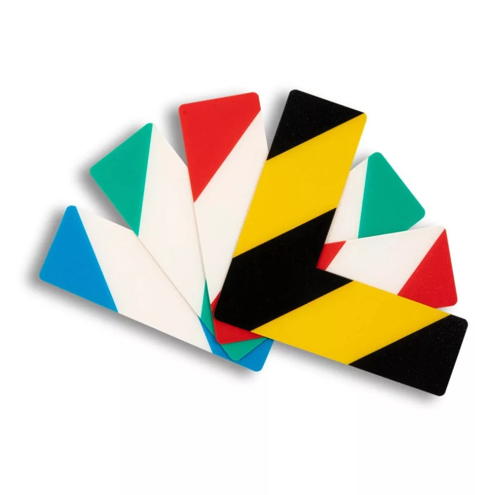 Ezek az L alakú padlójelölők is sarokjelölésként alkalmazhatóak, a rövid változat alternatívájaként. A hosszú L alak használatával nagyobb területeken is biztosított a jó láthatóság.