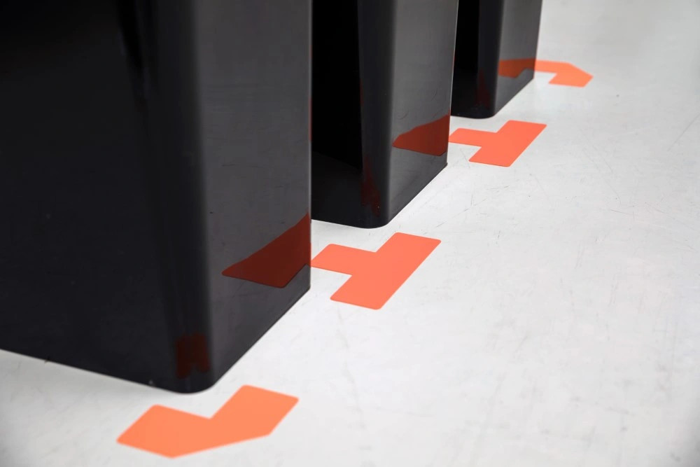 Ezek a jelölések 0,3 mm vastagságúak, ami lehetővé teszi, hogy könnyen alkalmazkodjanak az egyenetlen felületekhez. Rugalmasságuknak köszönhetően ellenállnak a komoly igénybevételnek, például a csúsztatott raklapok vagy dobozok, targoncák és logisztikai eszkzök okozta terhelésnek. Így nem fognak könnyen megsérülni vagy elválni a padlótól.