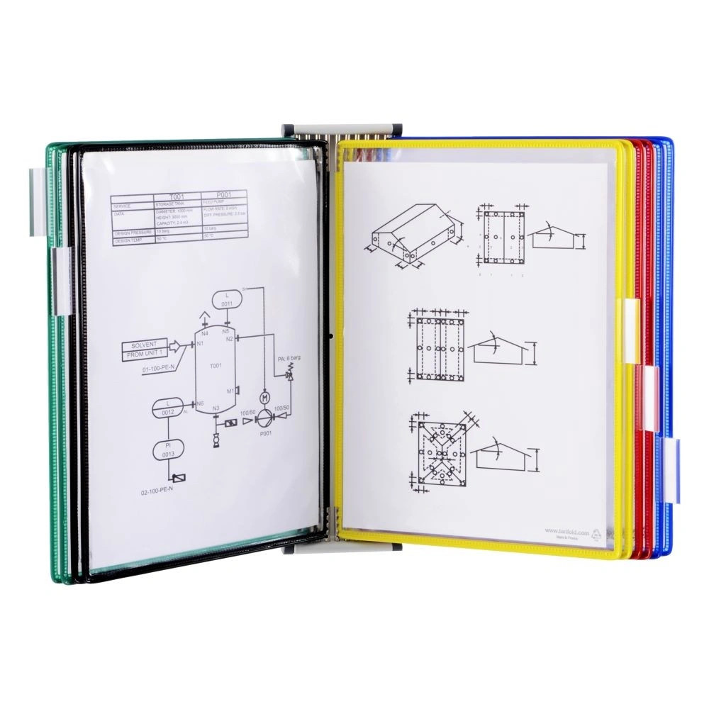 Mágneses fali tartó szett, fém, A4, 10 db, vegyes bemutatótáblával A fontos információk gyors és egyszerű eléréséhez. A fali szett tartalmazza a mágneses, fém fali tartót, a 10 db színes műanyaggal bevont, acélkeretes, tartós és rugalmas bemutatótáblát, a táblákhoz 5 db indexfület. A tábla a fém forgócsapjának köszönhetően könnyedén a tartóba helyezhető és kivehető. Védi a dokumentumokat a szennyeződésektől, melyek könnyedén cserélhetők. Alkalmas ipari üzemekben, raktárakban, szekrényeken, gépek oldalán, üzletekben stb. történő használatra. kétoldalú, álló, felülről nyitott bemutatótáblák, 5 db index fül mágneses hátoldalú fali tartó acélhuzal keret fém fali tartó (RAL 7035), a bemutatótábla tükröződésmentes PVC 4 db műanyag záró ütközővel 10 év garancia kiszerelés: 1 szett/doboz