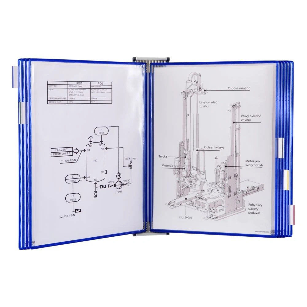 Wall holder A3 metal + 10 pcs blue, standing display boards in set For quick and easy access to important information. The wall set includes the metal wall holder, 10 steel-framed, durable and flexible displayboards coated with coloured plastic, 5 index tabs for the boards and the screws for mounting. Thanks to its metal pivot, the board can be easily inserted and removed. It protects documents from dirt and can be easily replaced. Suitable for use in industrial plants, warehouses, shops, etc.
