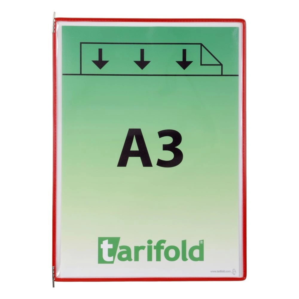 Bemutatótábla A3, vegyes, álló, felül nyitott, 10 db - 10 db A bemutatótábla kiemelkedő minőségének köszönhetően flexibilis, strapabíró és rendkívül hatékony. A kétoldalú bemutatótábla a Tarifold tartókba tervezett prezentációs rendszerek részét képezi. A táblák műanyaggal bevont, acélhuzal kerete tartós és egyben rugalmas tartást eredményez. A tábla a fém forgócsapoknak köszönhetően a tartókba könnyen behelyezhető és eltávolítható. Alkalmas ipari üzemekben való használatra. A bemutatótábla védi a dokumentumokat a szennyeződésektől és a nedvességtől, ugyanakkor a dokumentumok könnyen cserélhetők.